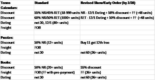 10% off any size order or Free Freight on orders of $1200 or more. All orders must be received and shipped by March 31, 2026. https://wholesale.whitemountainpuzzles.com/ - check out the newest puzzles on line!